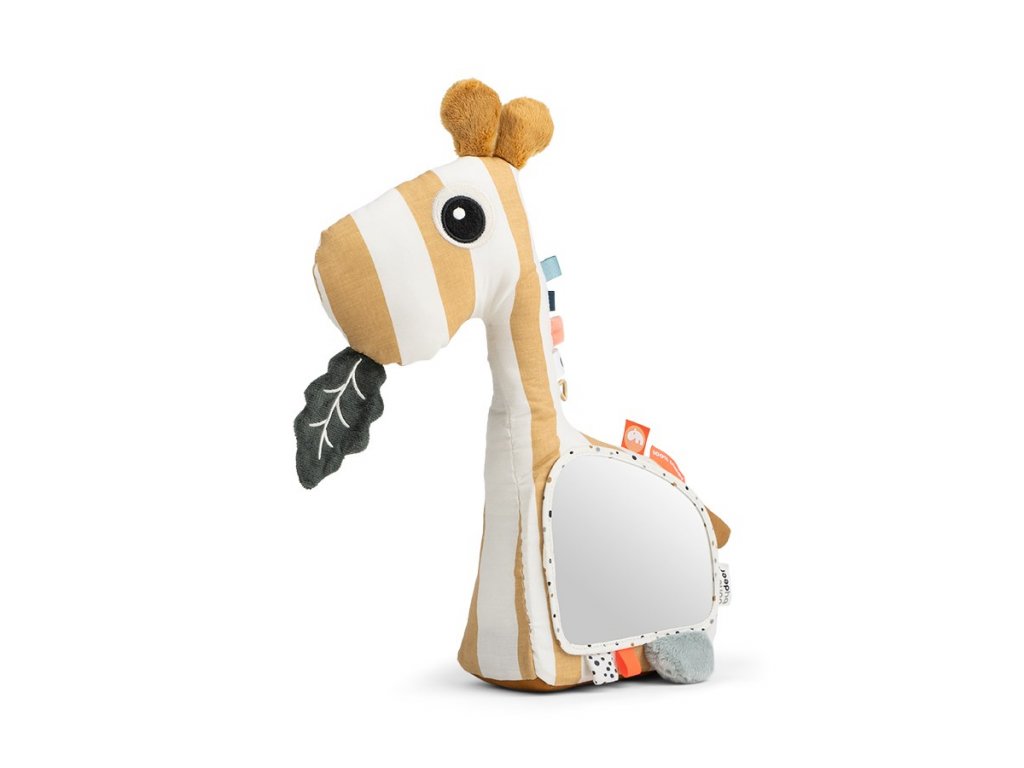Malé deti baví ich vlastný odraz, vďaka ktorému je podlahové zrkadlo Raffi ideálne pre povzbudenie trénovania pozície na brušku. Veľa senzorických funkcií ich povzbudí k ďalšiemu a aktívnejšiemu pobytu na brušku. Zrkadlo Raffi je navrhnuté so zmyslovými aktivitami, ako sú farebné štítky, hmatové textury, zvuky – je toho toľko, na čo sa pozerať a skúmať. Zrkadlo s výplňou vreca s pieskom stojí pevne na podlahe a možno s ním ľahko pohybovať. Sladká žirafa je v kontrastných bielych a horčicových pruhoch s jemne zeleným listom, ktorý sa pri dotyku skrúti.