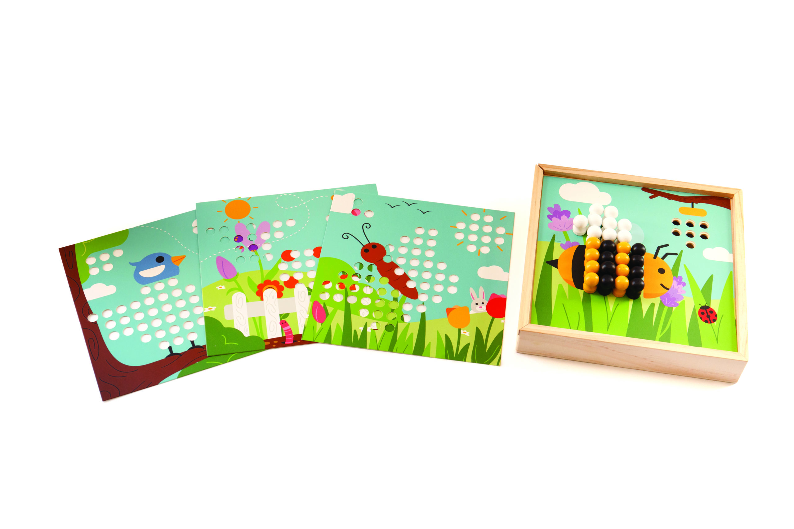Rozohrajte obrázky s motívmi záhradky pomocou rôznofarebných kolíčkov. Umiestňujte ich v súlade s okolitými farbami, alebo podľa vlastnej fantázie. Nechajte deti hrou rozpoznávať farby, rozvíjať poznávacie schopnosti, sústredenie a zručnosť. Obrázky sa umiestňujú na veko kompaktnej krabičky, do ktorej môžete všetky súčasti prakticky uložiť. Mozaika tak môže byť vždy uprataná aj pripravená na cesty. Všetky súčasti sú vyrobené z kvalitného a zodpovedne získaného dreva, ktoré je príjemné na dotyk, a pomáha tak prirodzene stimulovať hmat.