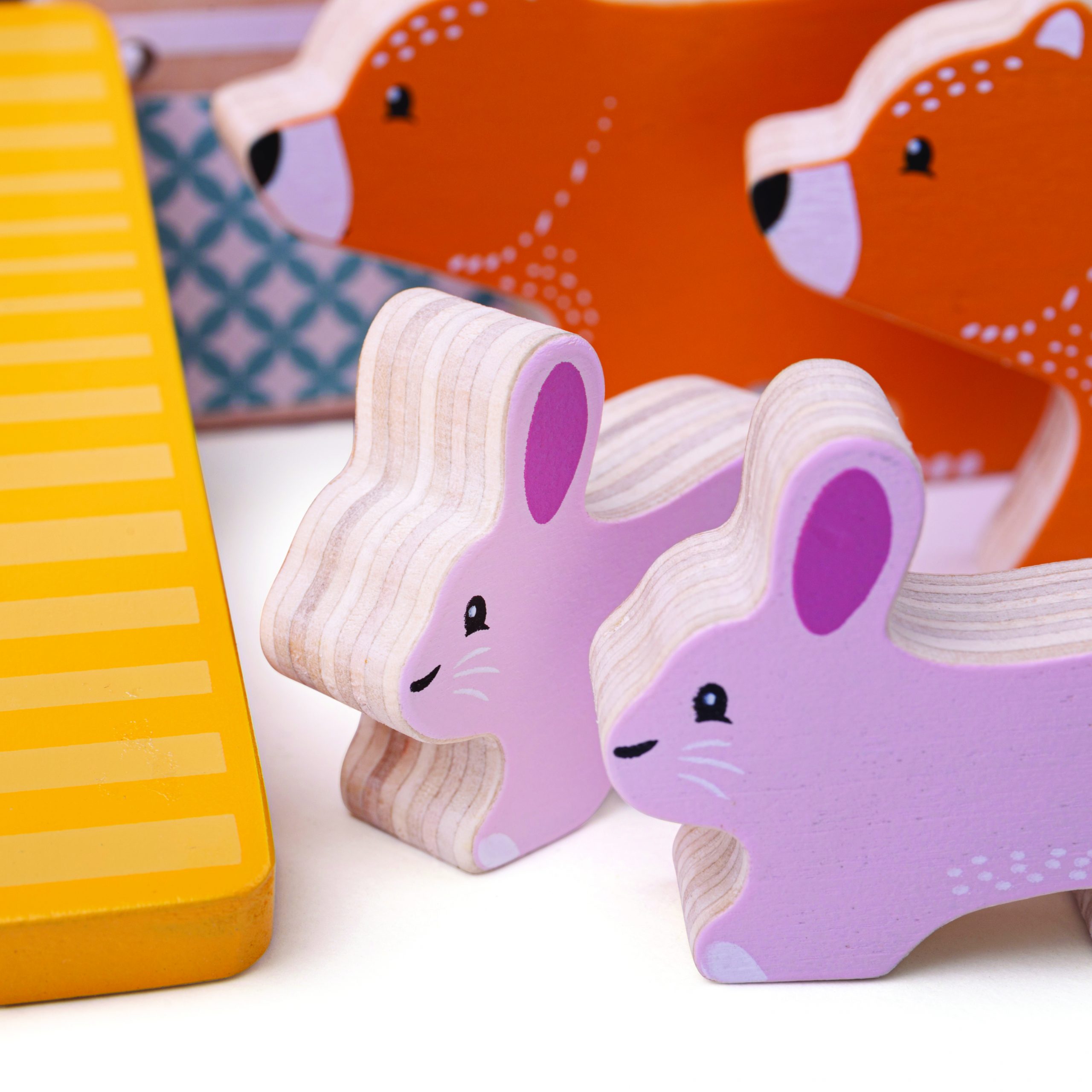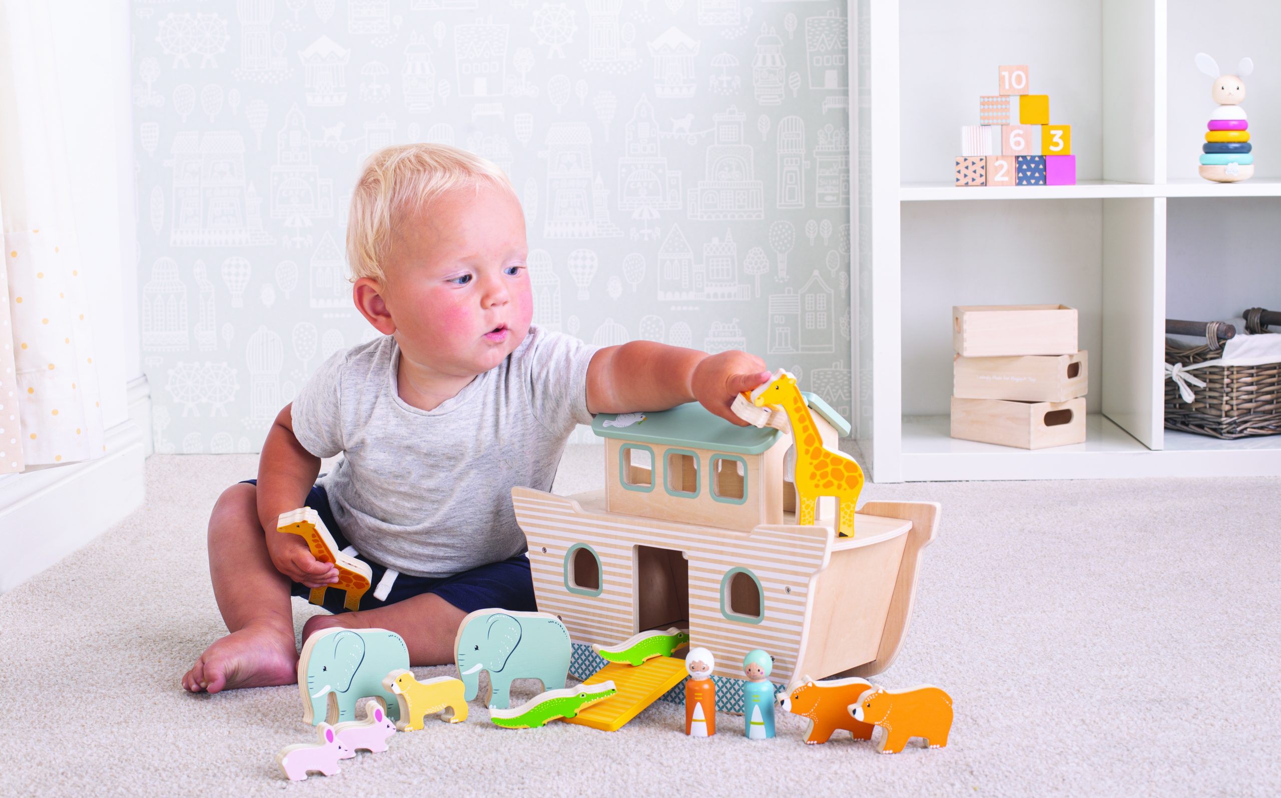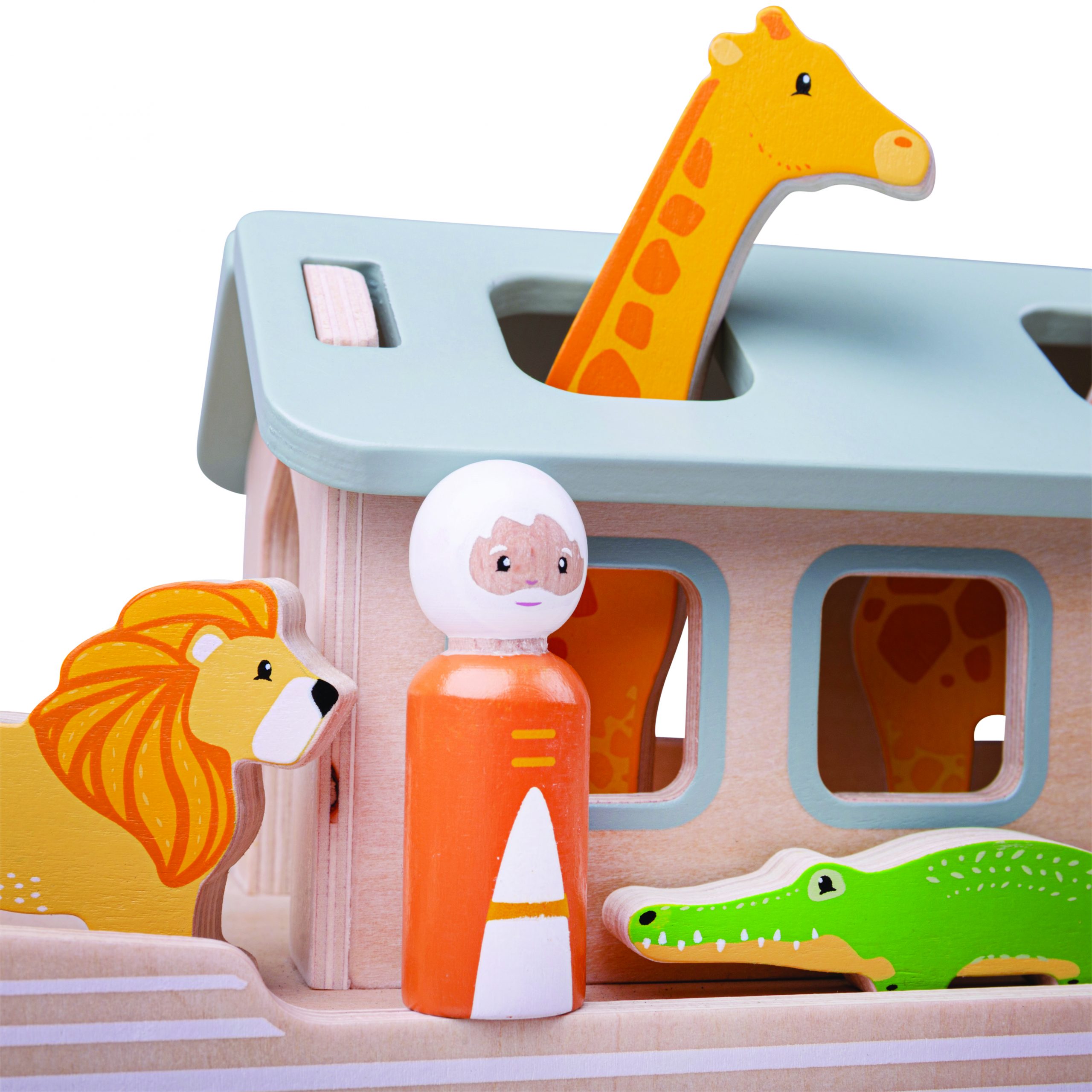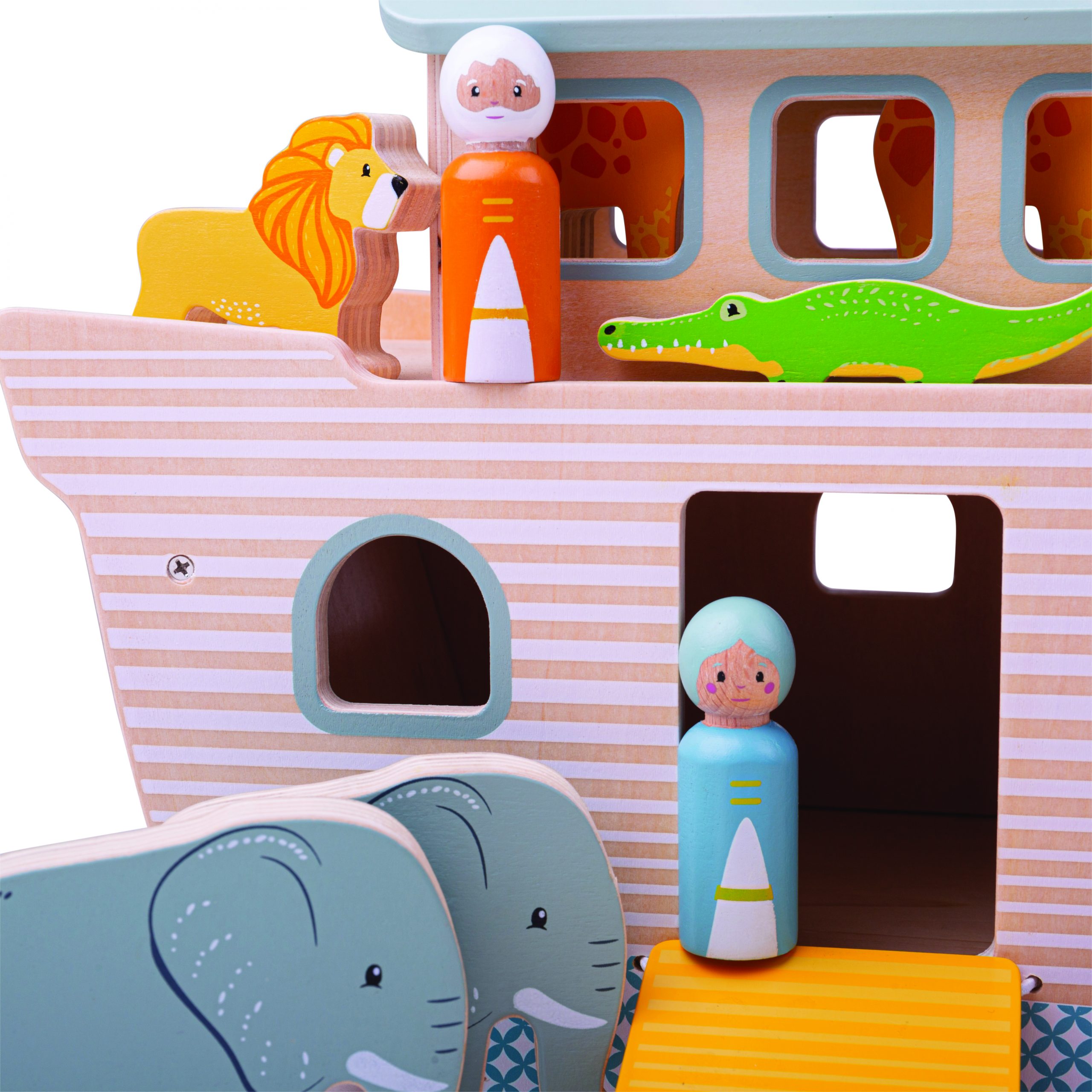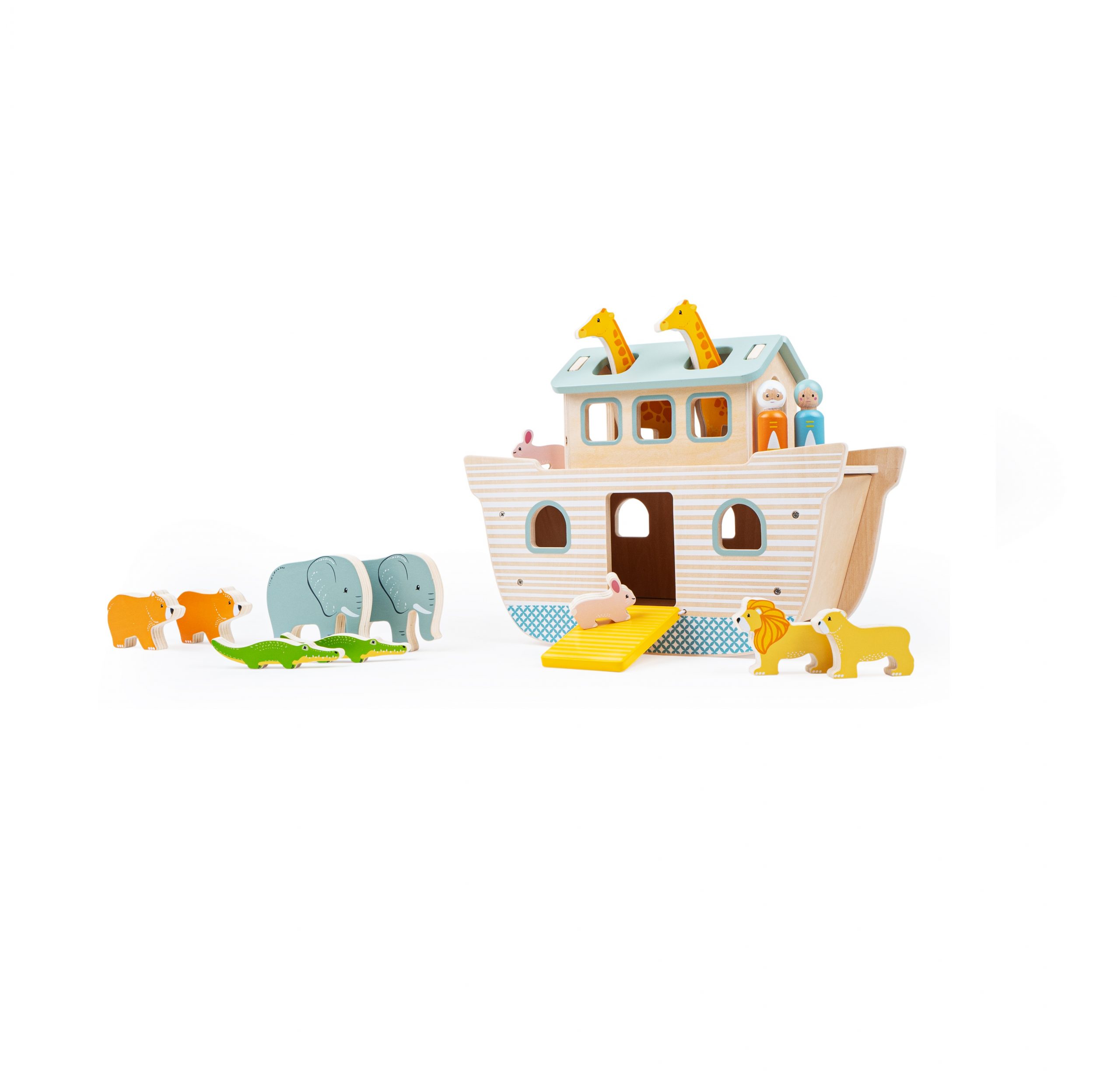 Maľované farbami bezpečnými pre deti, rozdielne farby a textúry stimulujú detskú myseľ. Drevená archa je vyrobená z FSC materiálov, z dreva z eticky spravovaných lesov. Zvieratká sú z hladkého dreva a veľkosť majú tak akurát pre detské ruky. V balení postavičky 12 zvierat a 2 osôb.