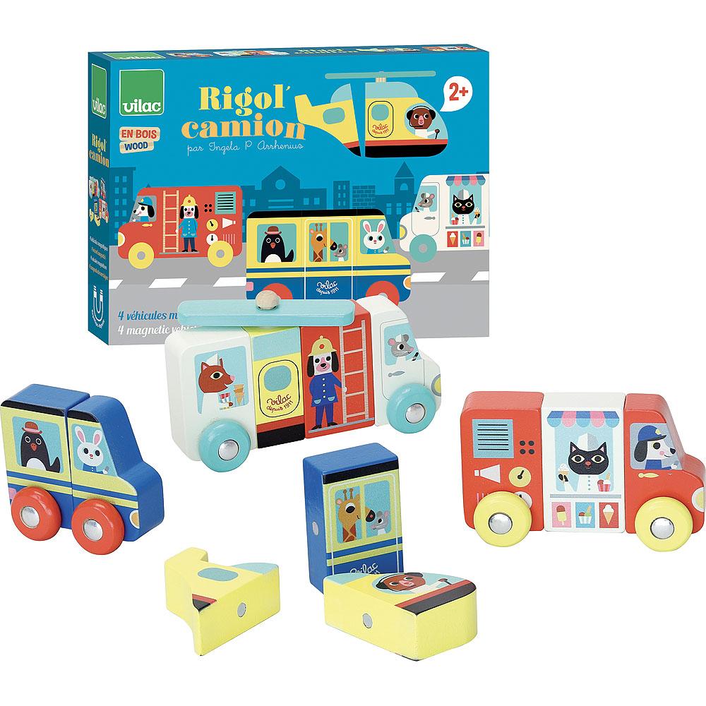 Zábavné drevené magnetické puzzle s ilustráciou Ingely P. Arrhenius. hasičské auto, autobus, zmrzlinárske auto a helikoptéra, ktorých časti môžete kombinovať. Vhodné od 2 rokov.