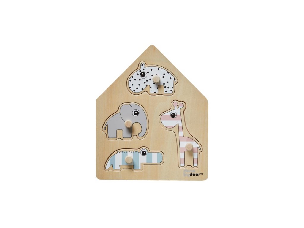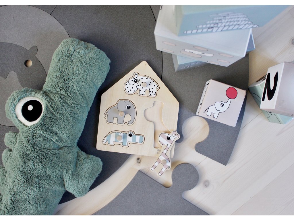 Zvierací kamaráti Elphee, Croco, Ozzo a Raffi spoločne tvoria toto roztomilé drevené puzzle. Pomáha rozvíjať motorické schopnosti batoliat a bude aj krásnym doplnkom do každej detskej izbičky.